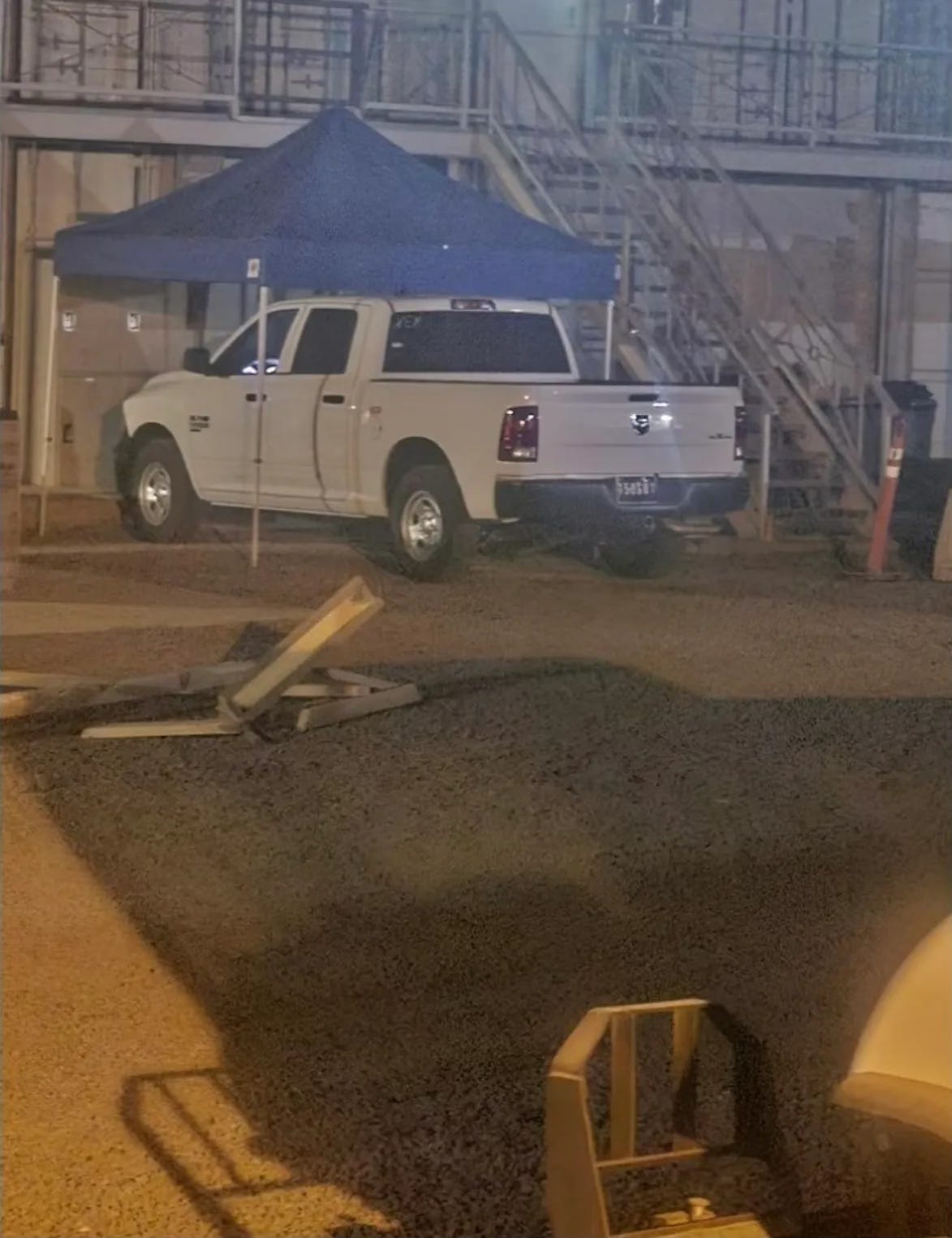 Conditions were, of course, even harsher for the detainees. They were housed together in a cramped shipping container ordinarily used as a conference room, where they were also exposed to the fumes. There was no plumbing or natural light, since, the source said, the only window was on the door to the conference room and a Navy Police truck sat idling under a tent in front the door the entire time the detainees were there. Satellite images confirm the presence of the truck and tent in the area of the base pictured in a photograph provided by the source, showing the outside of the room where he said the detainees were held.