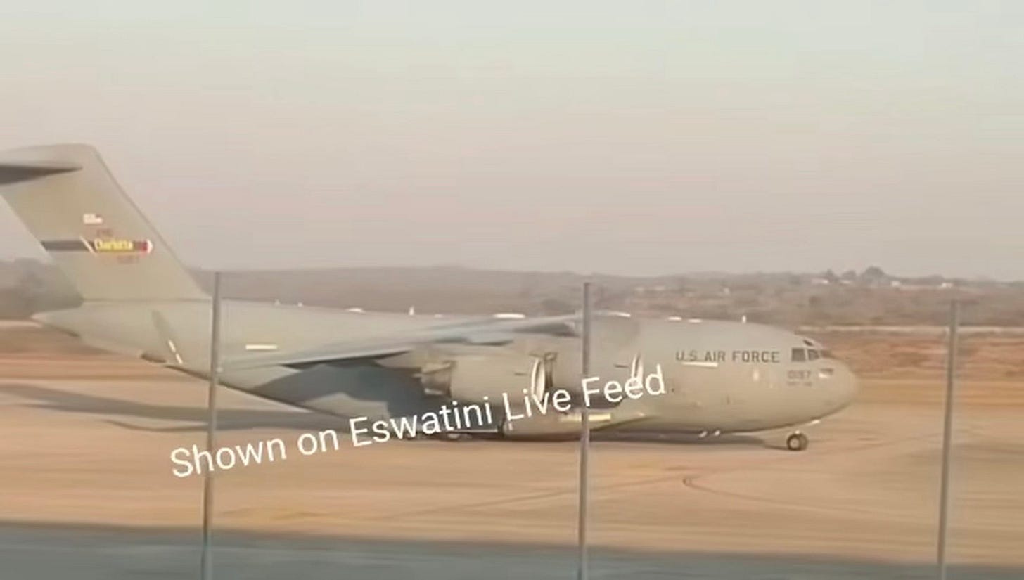 Hours later, DHS spokeswoman Tricia McLaughlin announced five more migrants had been removed to a third country. She didn’t say how the men got there, but a video later posted to an Eswatini Facebook group shows a U.S. Air Force C-17 Globemaster III with the registration number 02-1107 taxiing down a runway that matches satellite images of King Mswati III International Airport.