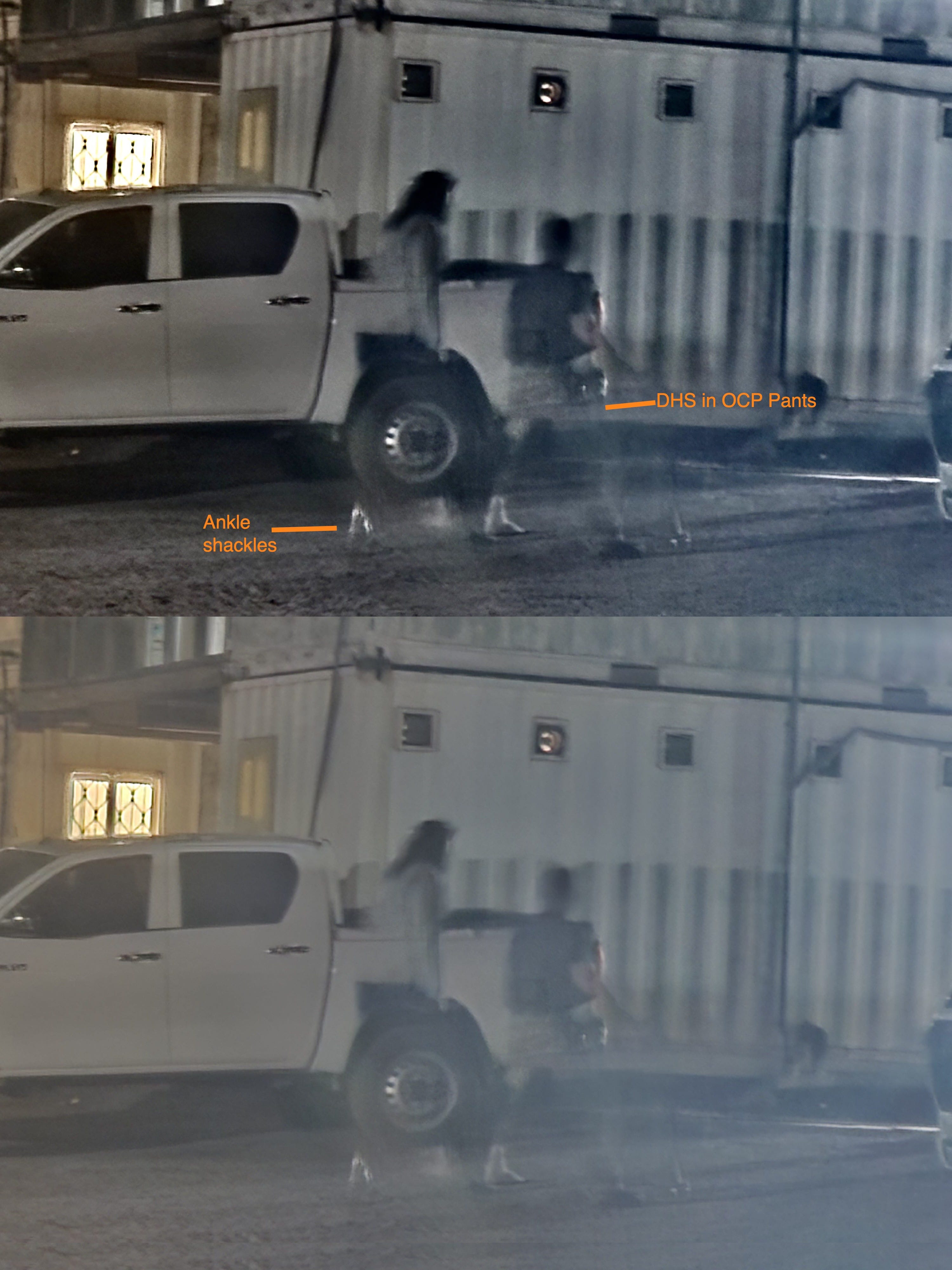 The source also provided a photo they took of one of the detainees, shackled at the ankles and being escorted by a guard to a neighboring building with a toilet.